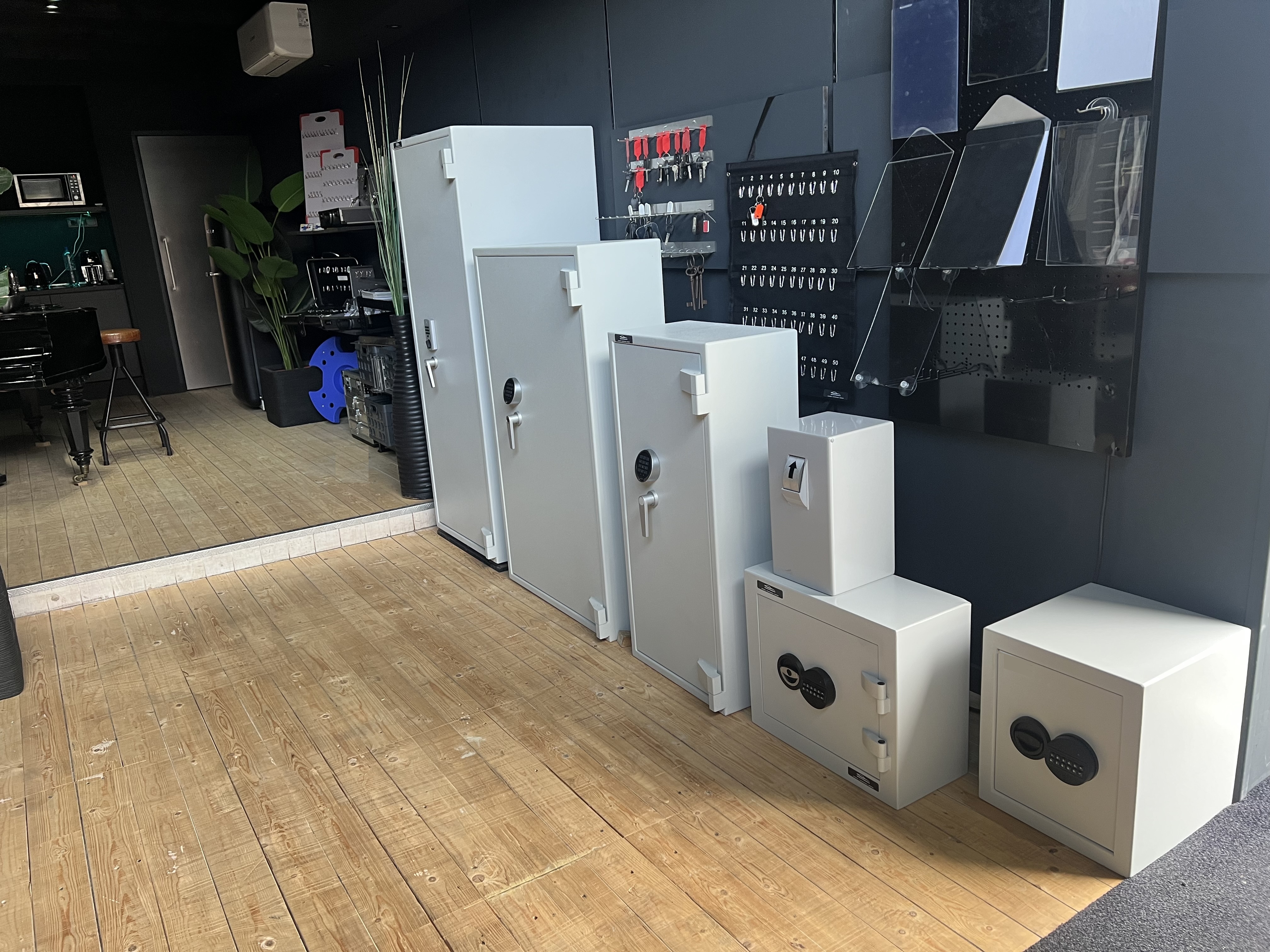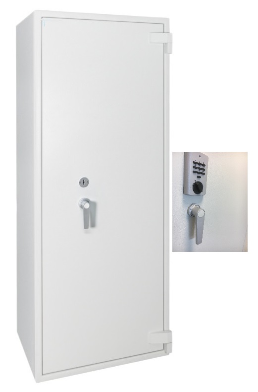 Kluis van hoogwaardig staal Volledig dubbelwandig Keuze uit 100 haken Centraal regelwerk met sluitstangen naar voor, boven en onder. Classificatie: inbraakwerend EN 14450 Klasse S2 Elektronisch cijfercodeslot met master- en gebruikerscode Het slot is in de omgeving van de klavieren door een pantserplaat beschermd Een speciaal profiel aan de scharnierzijde beschermt de deur extra tegen inbraak De kast is volledig voorzien van brandwerend isolatiemateriaal Een doorlopend dichtsluitend profiel verhindert het direct indringen van vuur of hete brandgassen Afmeting: H1600 x B700 x D560 Gewicht:190Kg Kleur: RAL 7035 Grijswit