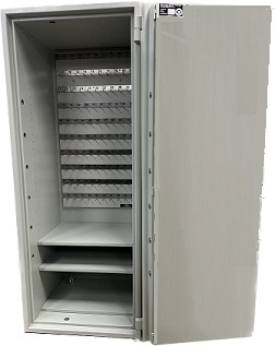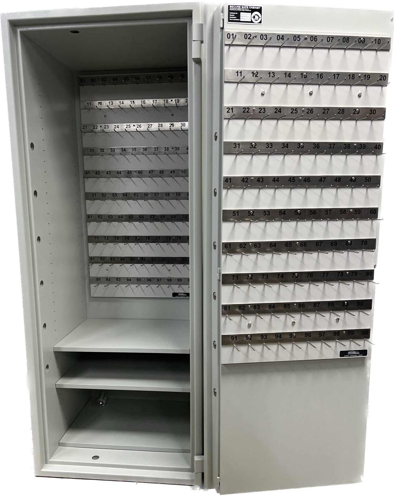 Kluis van hoogwaardig staal Volledig dubbelwandig Keuze uit 100 haken of 200 haken Centraal regelwerk met sluitstangen naar voor, boven en onder. Classificatie: inbraakwerend EN 14450 Klasse S2 Keuze uit: - Dubbelbaard veiligheidsslot met automatisch dubbelzijdig werkende messingklavieren - Elektronisch cijfercodeslot met master- en gebruikerscode Het slot is in de omgeving van de klavieren door een pantserplaat beschermd Een speciaal profiel aan de scharnierzijde beschermt de deur extra tegen inbraak De kast is volledig voorzien van brandwerend isolatiemateriaal Een doorlopend dichtsluitend profiel verhindert het direct indringen van vuur of hete brandgassen Afmeting: H1600 x B700 x D560 Gewicht:190Kg Kleur: RAL 7035 Grijswit